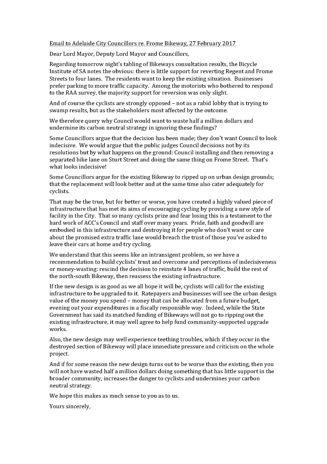 20170227 Letter ACC Councillors re Frome BikewayPublished February 28, 2017 in BISA lobbies Adelaide, Unley councillors.
